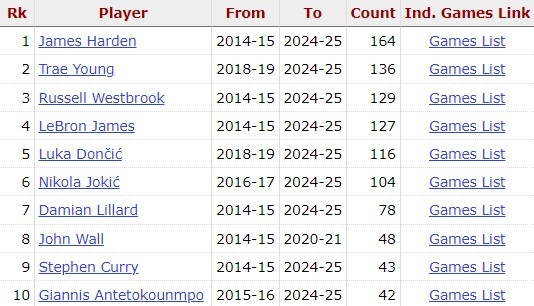 據(jù)統(tǒng)計(jì),在過(guò)去10年里,哈登已經(jīng)165場(chǎng)比賽得到至少25分10助攻,同期所有球員中最多。