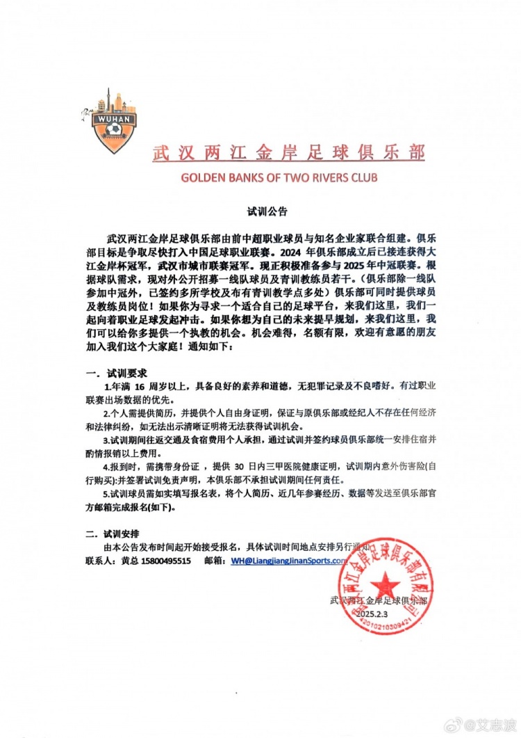 2月6日訊 近日,武漢兩江金岸足球俱樂(lè)部官方發(fā)布試訓(xùn)公告。
